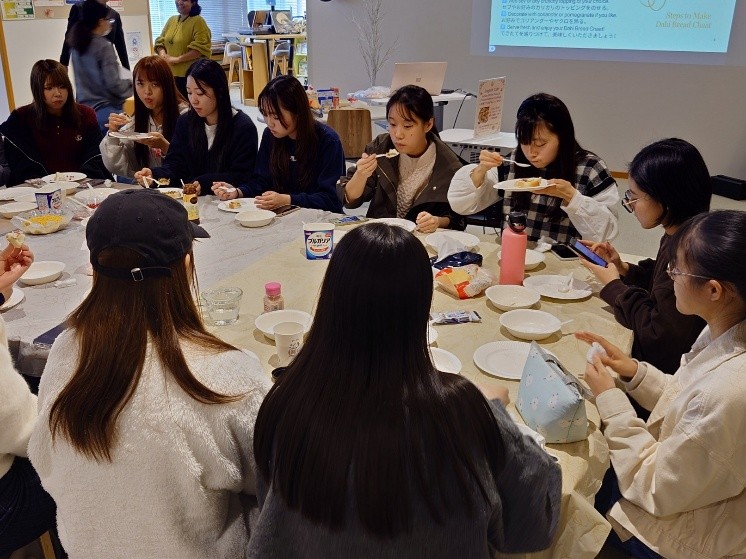 完成したChaatは、色合いがユニークです。できあがったChaatを学生たちは実食してみると、「想像以上に酸っぱさ・しょっぱさ・辛さが同居している」「ザクロの種の甘酸っぱさ・種の触感が加わって、爽やかな味わい」といった声が聞かれました。 今回のChaat作りは、昼休み等での実施でしたが、学生たちのインド文化への関心をさらに高めるよい機会となりました。