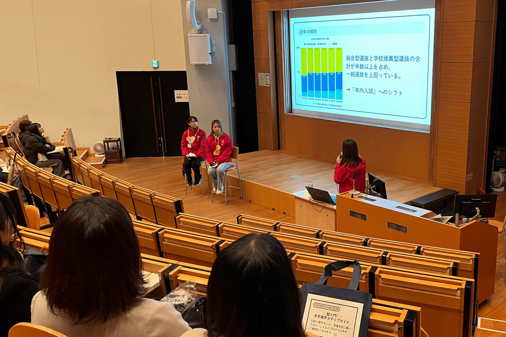 その後、在学生2名が登壇し、高校生のときに力を入れていたことや、入試に向けてどのように準備したかなど、自分の経験を具体的に話していました。会場からはメモを取りながら聞いている高校生の姿が多く見られました👀
