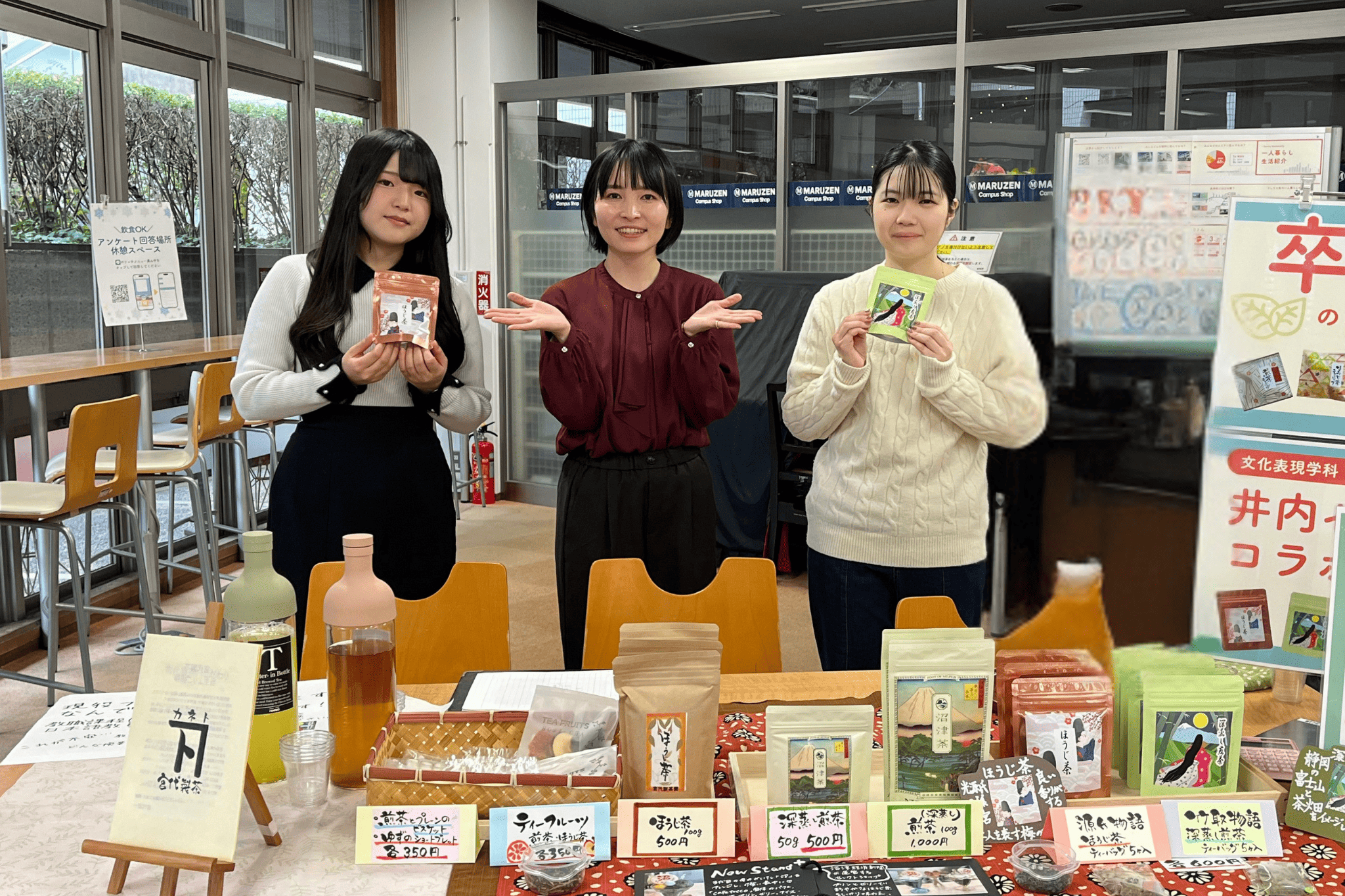 老舗お茶屋さん × 文化表現学科・井内ゼミのコラボ企画では、ゼミ卒業生でもある宮代製茶の3代目次期社長と一緒に、学生が考案したパッケージのお茶を販売しました🍵