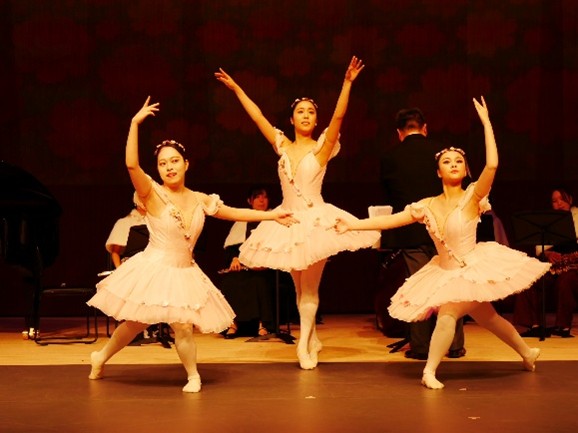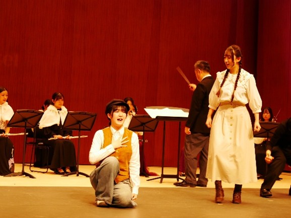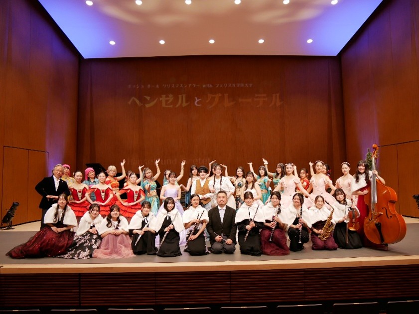 舞台では、学生による歌唱とミニオーケストラの演奏に加え、ダンスやバレエも取り入れ、フェリスならではの芸術表現が響き合う華やかなステージとなりました。今回の作品は、学生一人ひとりの得意分野を踏まえて個々の表現力を最大限に引き出されるよう、教員が新たに編曲。練習では、音を聴き合い、動きを合わせながら、それぞれの表現を響かせ合って一つの舞台を創り上げていきました。