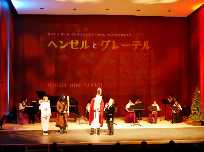 ドイツ語によるオペラ『ヘンゼルとグレーテル』を子どもたちにも親しんでもらえるよう、劇中で『くるみ割り人形』の音楽によるダンスやバレエを組み込むなど、フェリスオリジナルバージョンにアレンジして上演。東京横浜独逸(ドイツ)学園やドイツにゆかりのある企業が多い都筑区という地域特性をいかした公演となりました。
