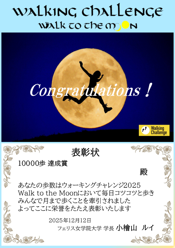 フェリス参加者の1日平均歩数は7754歩、全国19位という結果でしたが、1日平均8000歩以上達成者は76名、そのうちの1万歩以上達成者が33名おり、月までの2往復(合計歩数1,826,025,301歩)に大きく貢献しました。