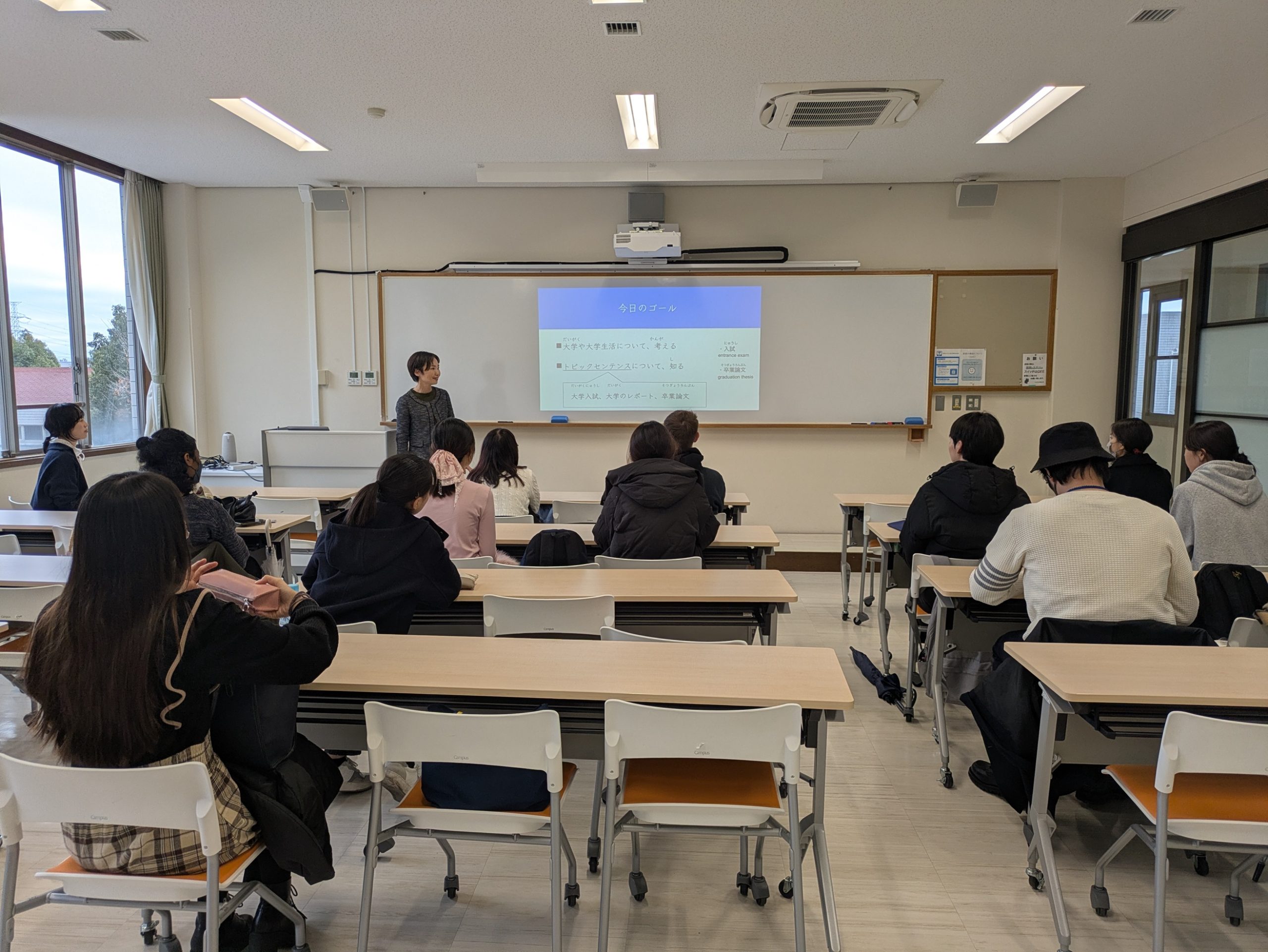 はじめに、本企画の趣旨説明とプログラム概要の紹介が行われ、その後、本学で学ぶ私費留学生2名による学生生活紹介が実施されました。1年次の留学生からは、実践的で学ぶ楽しさのある授業内容や、日本語学校で学ぶ日本語と大学で学ぶ日本語の違い、日本人学生との交流機会の多さについて紹介がありました。また、ボランティア活動や学生広報活動など多彩な課外活動に触れ、「迷ってもまずは一歩踏み出すこと」「失敗を恐れず、自分を信じて挑戦してほしい」と、参加者に向けたメッセージが送られました。