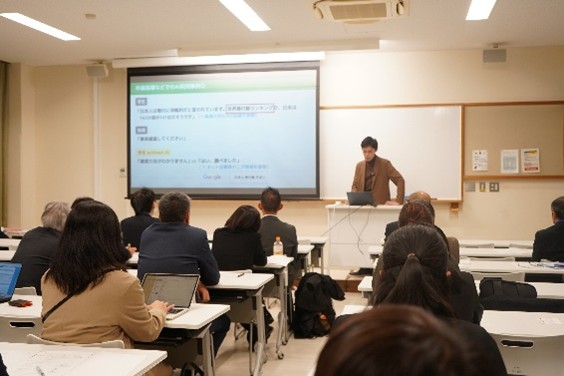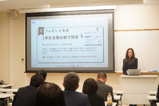 続いて「大学教育における生成AIの活用」について、本学教員が授業での実践事例を紹介しました。 生成AIを活用しながら、学生が自らの考えを言語化したり、AIの出力を批判的に検討したりする授業の取り組みなど、AI時代に必要とされる思考力や表現力を育む実践が共有されました。 AIという新しいツールを「学びを拡張するパートナー」としてどう活かすかを考える内容となり、会場では活発な質疑応答が行われ、参加された先生方からも多くの関心が寄せられました。