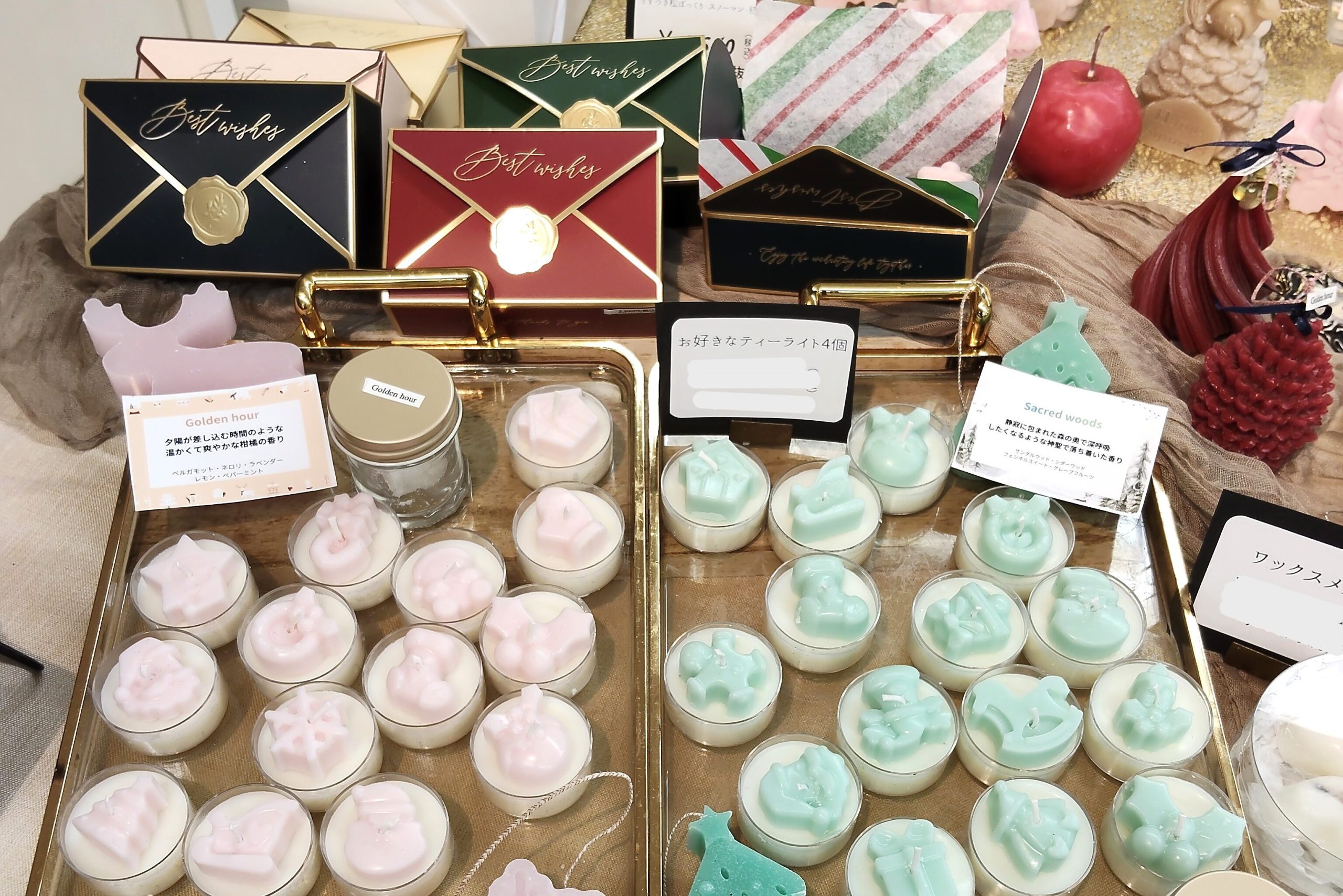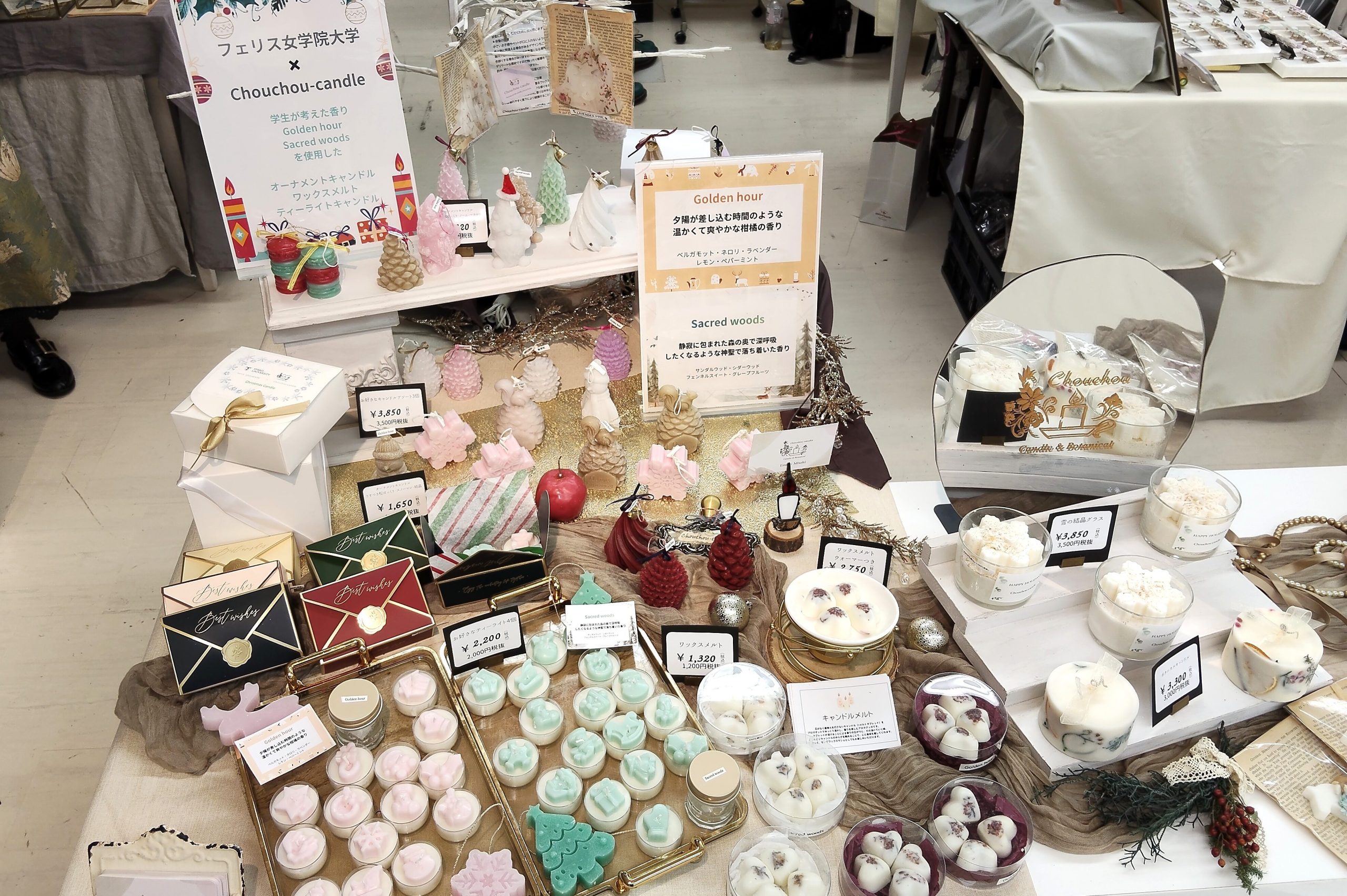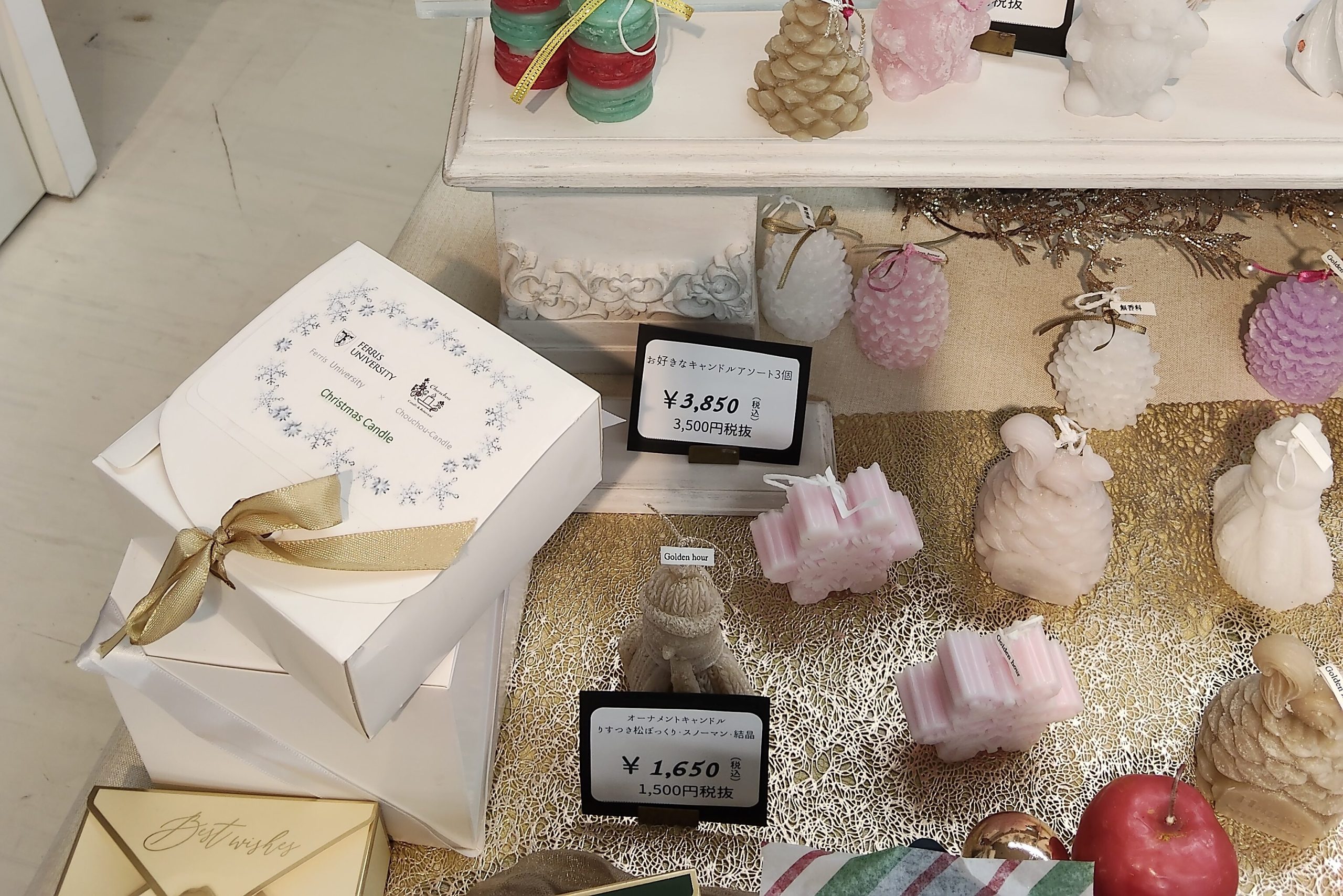 店頭には、学生たちのアイディアが随所に散りばめられた、温かみのある商品が並びました。 お好みのキャンドルを自由に組み合わせられる「アソートタイプ」では、フェリス女学院大学のロゴが入った特別なパッケージを選ぶこともできます。