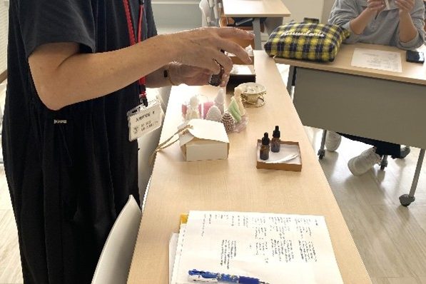 さまざまな香りを試し、アロマオイルの分量を調整しながら、試行錯誤の末に2種類のオリジナル香料が完成しました。香りの名称も学生の発案です。
