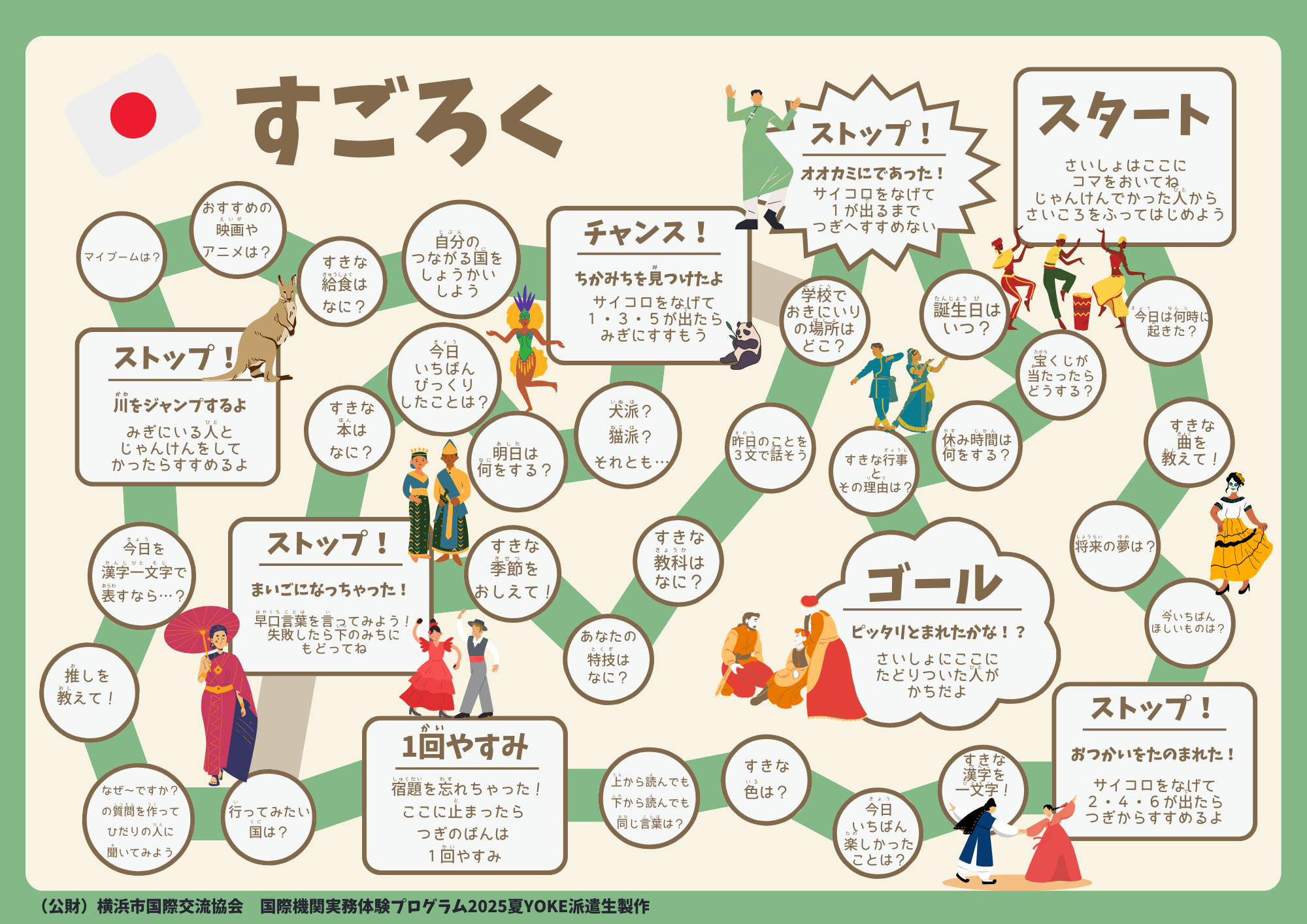 2025年度夏期は、国際社会学科1年の学生がYOKEへの派遣生となり、YOKEの事業理解、各所の国際交流ラウンジにおける夏休み日本語教室、日本語ボランティア入門講座、国際協力センター内の国際機関訪問など多くの経験をすることができました。YOKEではフェリスの他に、神奈川大学と明治学院大学の学生が一緒に活動し、共同プロジェクトを行いました。その成果が、外国籍の子どもたちが楽しみながら日本語を学べる「すごろく」作りです。