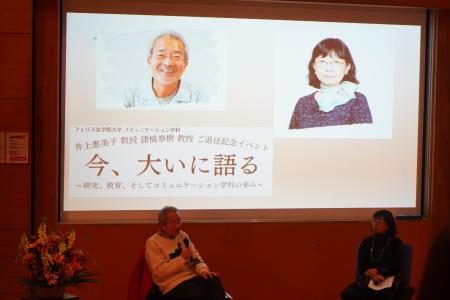 1月20日(火)、緑園キャンパスのキダーホールにて、井上惠美子教授、諸橋泰樹教授ご退任記念イベント 「今、大いに語る ~研究、教育、そしてコミュニケーション学科の歩み~」が開催されました。