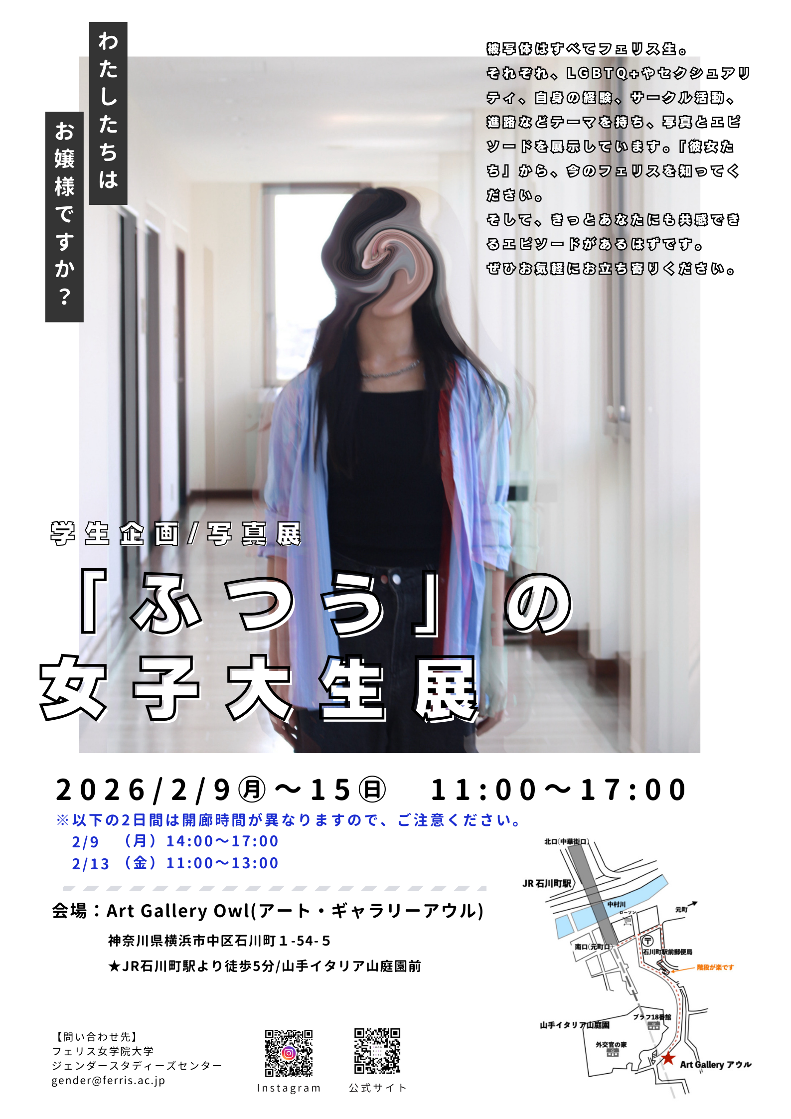 「本学キャンパスに在籍するフェリス生は多様であり、ひとりひとりにそれぞれの『ふつう』があります。『あなたも素敵、私も素敵』と認め合う空気にはあたたかさがあります。そのあたたかさを共有できる空間をつくりたいとの思いから、『『ふつう』の女子大生展』は企画されました。企画・運営、撮影、被写体に至るまで、フェリス生が担いました。」